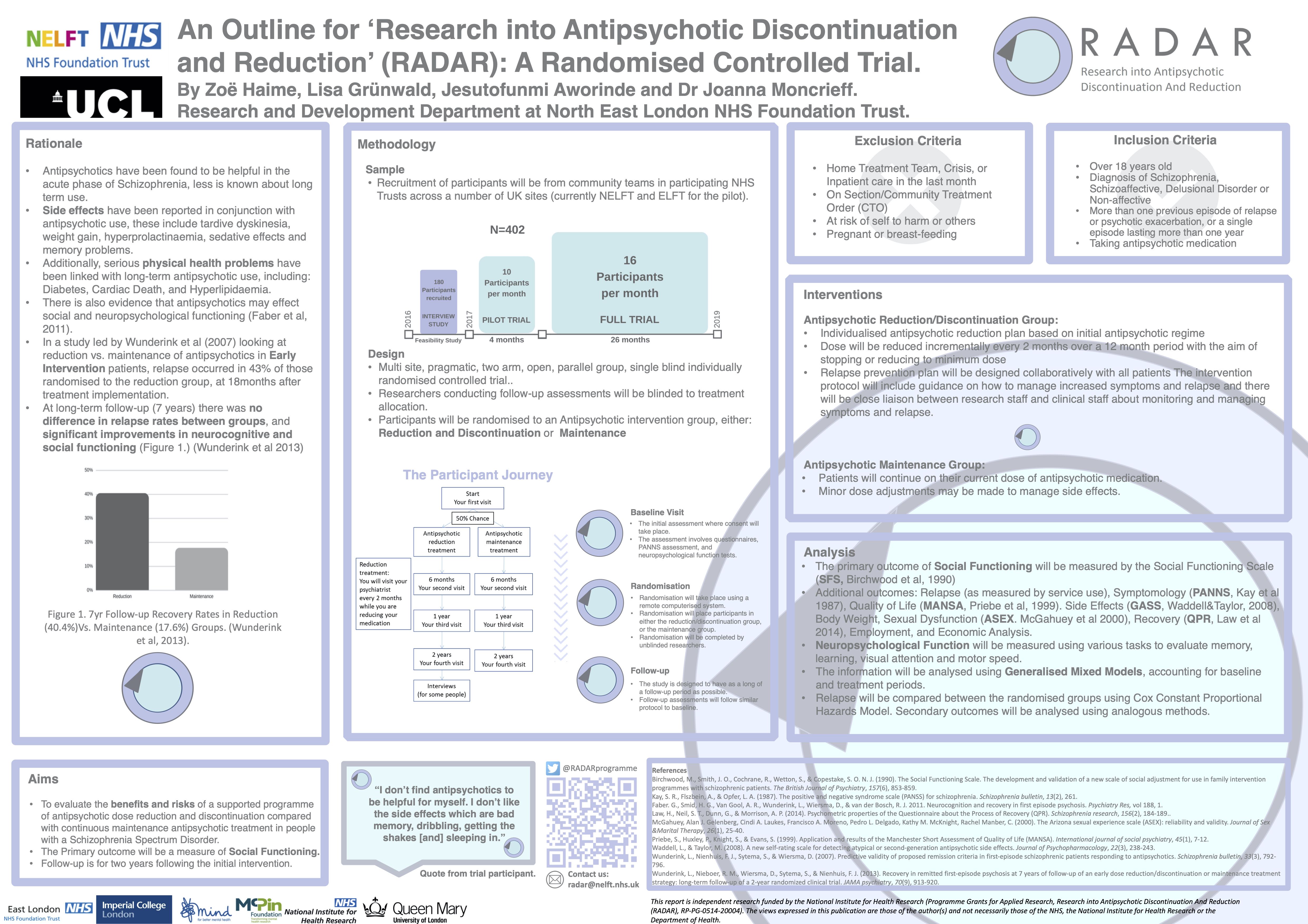 Research into antipsychotic discontinuation and reduction (RADAR) is a randomised controlled trial looking at effects of antipsychotic reduction on outcome measures including social functioning, neurocognition, and symptom scores.